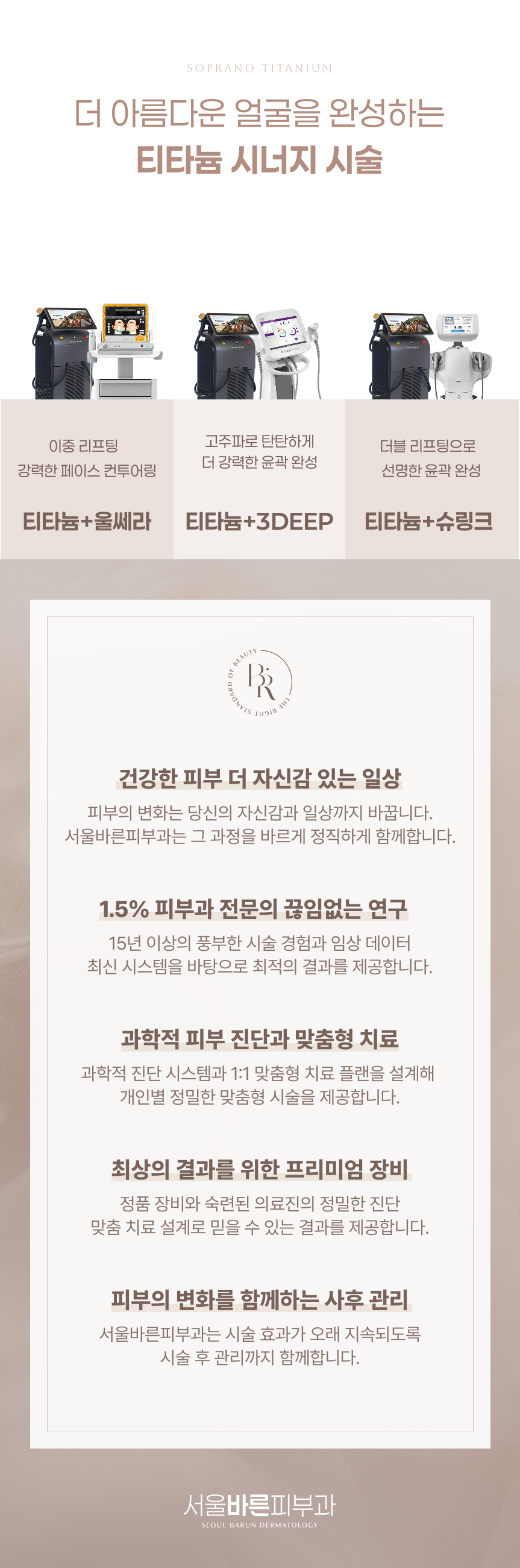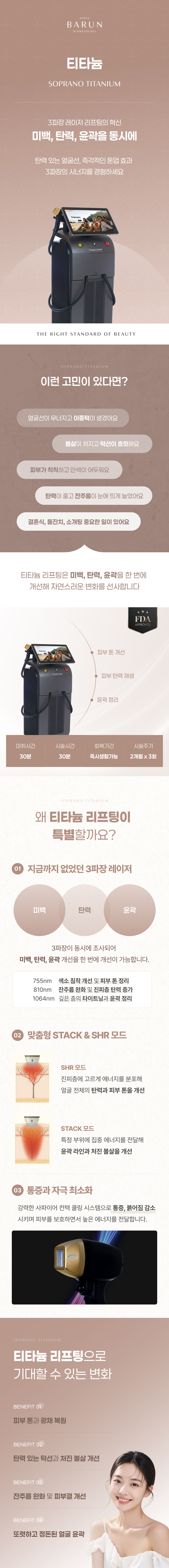 티타늄 리프팅은 3가지 파장을 동시에 조사해 윤곽, 톤, 탄력을 한 번에 개선합니다.