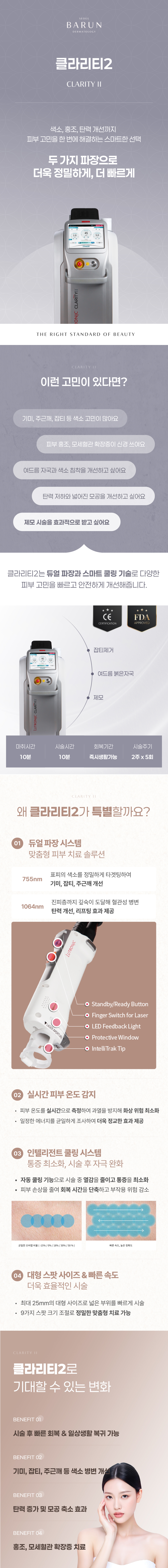 클라리티2는 755nm & 1064nm 두 가지 파장을 하나의 시스템에서 제공하여, 맞춤형 치료가 가능하고 시술 시간이 단축되는 장점이 있습니다. 또한, 자동 쿨링 기능이 있어 통증이 적고 부작용 위험이 낮습니다.