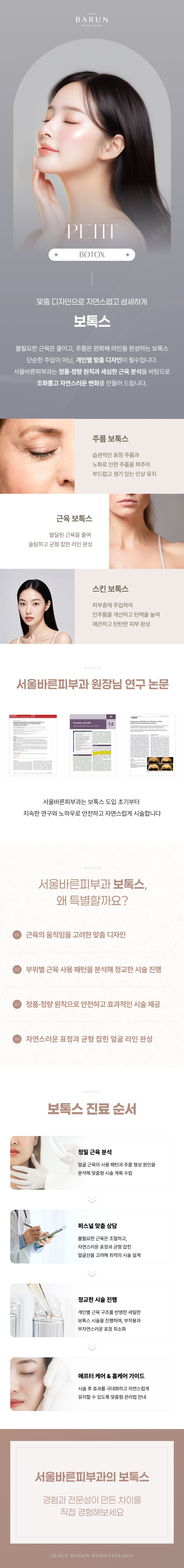 보톡스는 단순히 주름을 없애는 것이 아니라, 근육의 움직임을 조절하는 시술입니다. 서울바른피부과는 개인별 근육 사용 패턴을 정밀하게 분석해, 표정을 자연스럽게 유지하면서도 주름과 근육 발달을 개선할 수 있도록 맞춤 시술을 제공합니다.